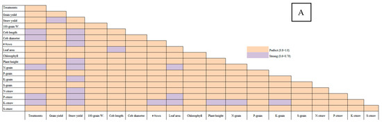 The Pearson correlation analysis revealed several key relationships between soil treatments and maize yield parameters across the four soils with varying salinities (Figure 7). In Soil 1 (EC = 3.68 dS/m), grain yield showed strong positive correlations with 100-grain weight (0.963), cob length (0.990), and cob diameter (0.941), indicating that treatments improving these traits could significantly enhance grain yield in low-salinity conditions. Similarly, chlorophyll content was highly correlated with grain yield (0.951) and plant height (0.894), suggesting that treatments promoting chlorophyll synthesis could improve both yield and plant growth. In Soil 2 (EC = 6.15 dS/m), straw yield was strongly correlated with grain yield (0.975), and chlorophyll content again showed a strong relationship with plant height (0.989), reinforcing the importance of chlorophyll in plant productivity. In Soil 3 (EC = 8.34 dS/m), 100-grain weight had a very high correlation with grain yield (0.966) and cob length (0.959), while chlorophyll content was strongly linked to leaf area (0.980). Finally, in Soil 4 (EC = 12.18 dS/m), grain yield was highly correlated with 100-grain weight (0.937) and cob diameter (0.979), and chlorophyll content was strongly associated with plant height (0.785). Overall, the findings highlight that treatments improving 100-grain weight, cob dimensions, and chlorophyll content are critical for enhancing maize yield, particularly in soils with moderate to high salinity.