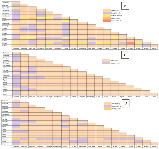 Pearson’s correlation between different salinity levels—(A) Soil 1 (EC = 3.68 dS/m), (B) Soil 2 (EC = 6.15 dS/m), (C) Soil 3 (EC = 8.34 dS/m), and (D) Soil 4 (EC = 12.18 dS/m)—and yield parameters of maize plants treated with different soil amendments (compost, elemental sulfur, sulfur nanoparticles, and their combinations).