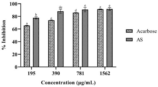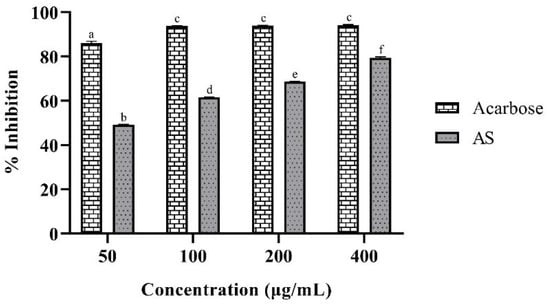 α-Glucosidase inhibition at different concentrations of AS hydroethanolic extract. Different letters indicate statistically significant differences (p < 0.05).