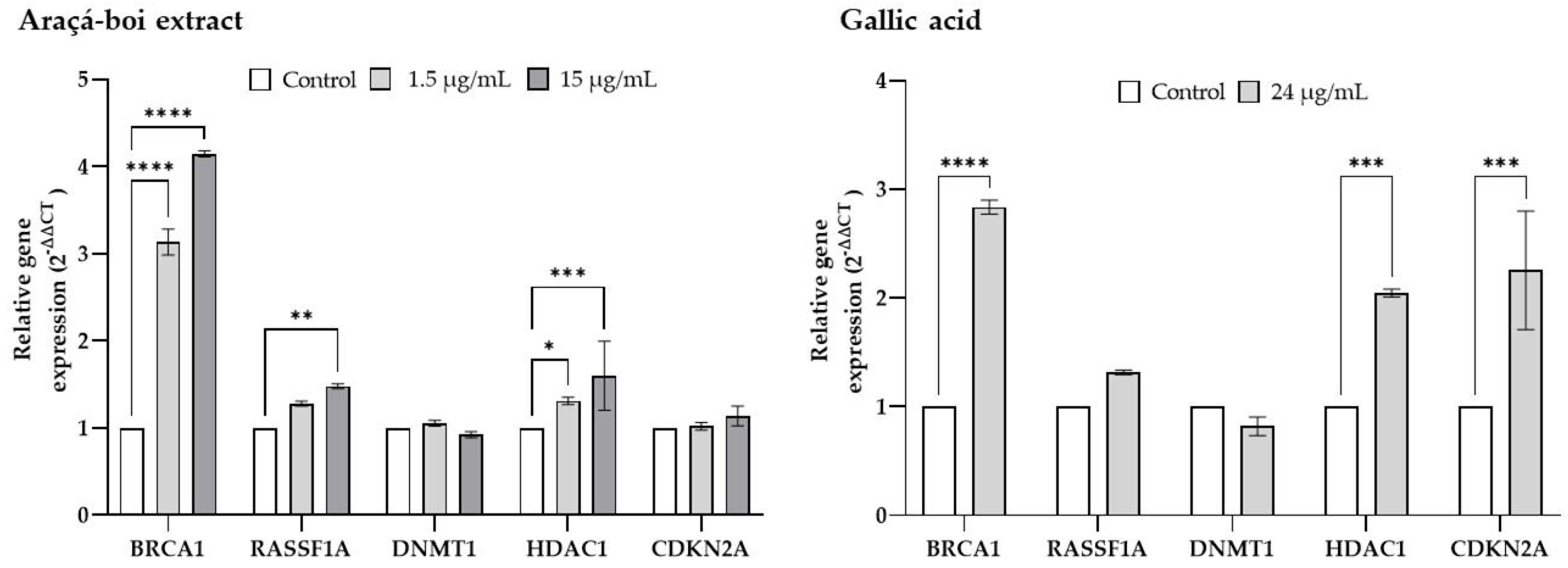 Chicago/Turabian StyleBorsoi, Felipe Tecchio, Henrique Silvano Arruda, Amanda Cristina Andrade, Mônica Pezenatto dos Santos, Isabelle Nogueira da Silva, Leonardo Augusto Marson, Ana Sofia Martelli Chaib Saliba, Severino Matias de Alencar, Murilo Vieira Geraldo, Iramaia Angélica Neri Numa, and et al. 2025. "Araçá-Boi Extract and Gallic Acid Reduce Cell Viability and Modify the Expression of Tumor Suppressor Genes and Genes Involved in Epigenetic Processes in Ovarian Cancer" Plants 14, no. 11: 1671. https://doi.org/10.3390/plants14111671