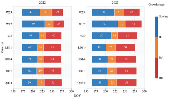 We found that old cultivars had longer vegetative growth, with mean lengths of 53 and 63 days for JX23 and WF7, while the mean length for newer cultivars (LD11, HD14, JD21, and QH34) was less than 40 days (Figure 1). The reproductive period of older cultivars (i.e., JX23 and WF7) was shorter than that of modern cultivars (including LD11, HD14, JD21, and QH34), especially during grain filling (R5–R8; Figure 1). The mean filling duration (R5–R8) was 36 and 35 days for JX23 and WF7 (older cultivars), while for modern cultivars it was 48, 48, 49, and 48 days for LD11, HD14, JD21, and QH34. The year 2023 saw longer reproductive periods, likely due to greater rainfall at the same period in 2022 (Figure 1).