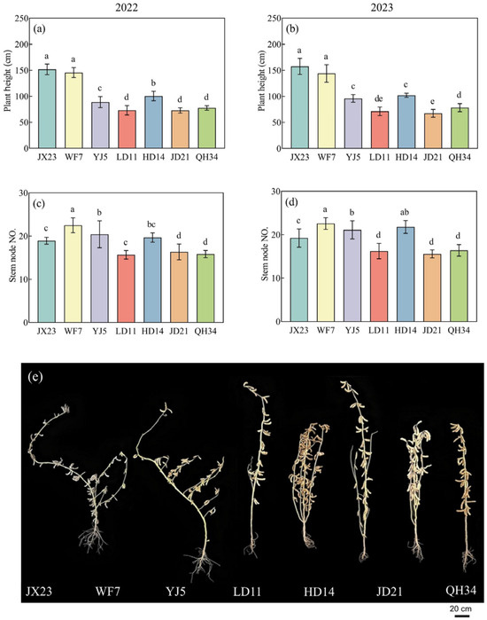 Plant height (a,b), and numbers of main stem nodes (c,d) of soybean cultivars grown in field experiments during 2022 and 2023, and (e) photo of plant phenotypes at the R8 stage in 2023. Error bars show standard error; different lowercase letters above bars indicate significant differences between cultivars (p < 0.05).
