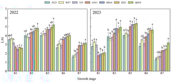 Leaf area index (LAI) of soybean cultivars released over several decades and grown in field experiments during 2022 and 2023. Different lowercase letters indicate significant differences between cultivars at the same growth stage (p < 0.05).