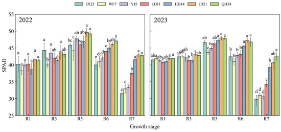 SPAD values (relative chlorophyll content) of soybean cultivars released during different decades and grown in field experiments during 2022 and 2023. Different lowercase letters indicate significant differences between cultivars at the same growth stage (p < 0.05).