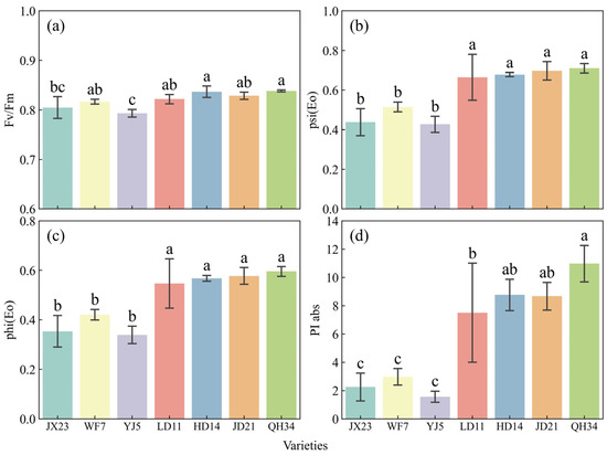 Cultivar breeding increased photosynthetic electron transport efficiency (Figure 5). The maximum quantum efficiency of photosystem II (Fv/Fm) increased from older cultivars (JX23, WF7, YJ5) at 0.79–0.82 to modern cultivars (HD14, JD21, QH34) at 0.83–0.84. The quantum yield of photosystem I [psi(Eo)] in the electron transport chain showed a pronounced increase, rising from older cultivars (0.43–0.52) to modern cultivars (0.68–0.71). Similarly, quantum yield [phi(Eo)] also exhibited an upward trend, increasing from 0.34–0.42 in older cultivars to 0.57–0.60 in modern cultivars. Performance Index (PIabs) showed the most notable change, increasing from 2.25 in the 1960s variety JX23 to 10.98 in the 2010s variety QH34, a remarkable 387% gain (Figure 5).