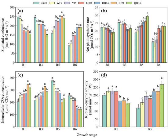 Dynamics of stomatal conductance (a), net photosynthetic rate (b), intercellular CO2 concentration (c), and Rubisco activity (d) at the reproductive stage in 2023 for soybean cultivars released during different decades. Data are presented as mean ± standard error; different letters indicate significant differences between cultivars at the same growth stage (p < 0.05).