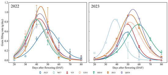 Dynamics of grain filling rate for soybean cultivars from different decades grown in field experiments during 2022 and 2023. Colored curves represent different cultivars. Error bars indicate standard error.