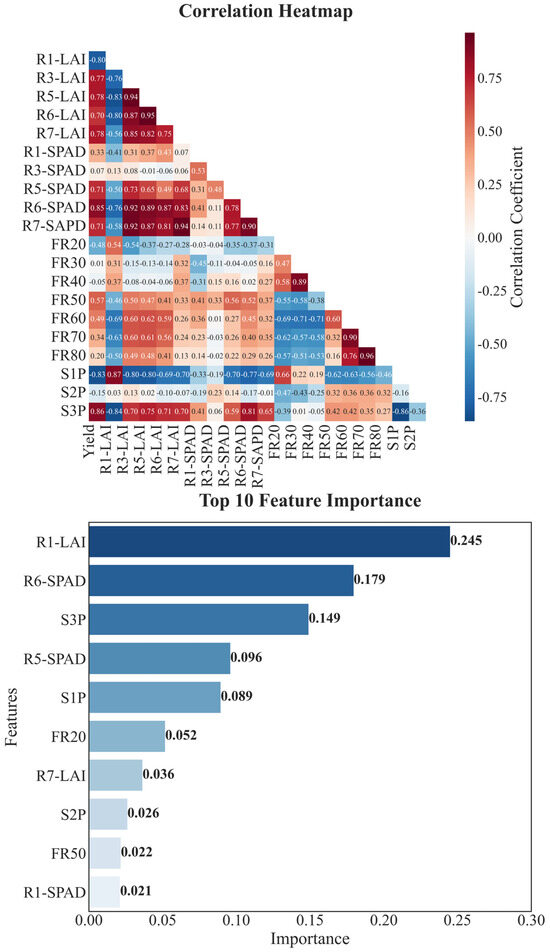 Correlation and importance analysis of soybean yield formation characteristics. Upper panel shows correlation heatmap between different characteristics, where darker colors indicate stronger correlations (red for positive, blue for negative). Lower panel shows feature importance ranking based on random forest algorithm. S1P, S2P, and S3P represent proportion of total growth period for Sowing–R1, R1–R5, and R5–R8 stages, respectively; R1-LAI, R3-LAI, R5-LAI, R6-LAI, and R7-LAI represent leaf area index across growth stages; R1-SPAD, R3-SPAD, R5-SPAD, R6-SPAD, and R7-SPAD represent relative chlorophyll content across growth stages.