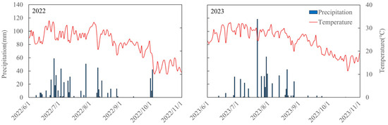 Daily mean temperature (red lines) and precipitation (blue bars) from 1 June to 31 October in 2022 and 2023.
