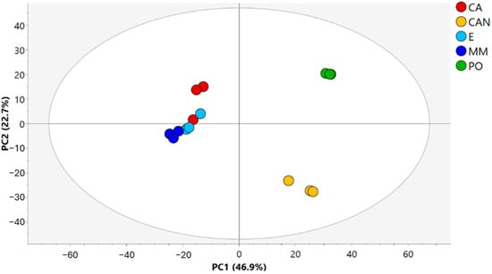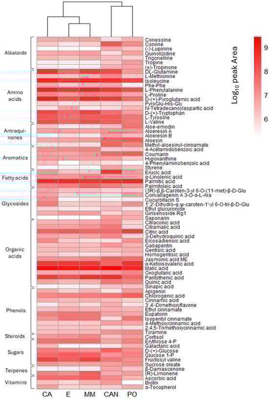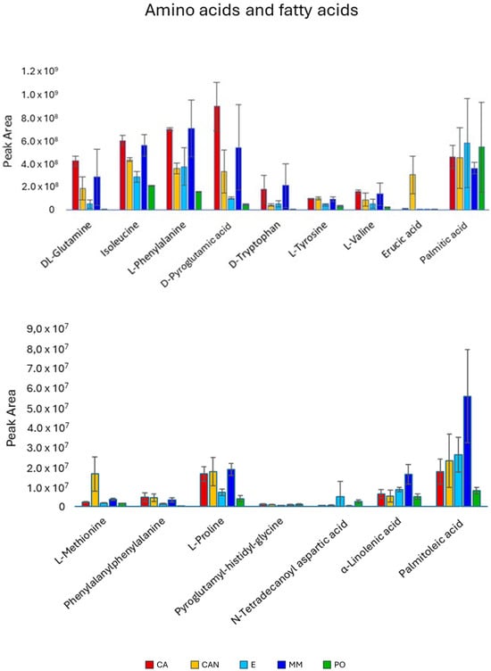 Amino acids (Figure 5) were generally found at higher amounts in CA and MM. The quantities of glutamine, isoleucine, and phenylalanine were significantly higher in CA than in CAN, E, and PO. The same trend was also observed for pyroglutamic acid and tryptophan. A high accumulation of methionine was noticed in the CAN sample, significantly more than in all the other samples.