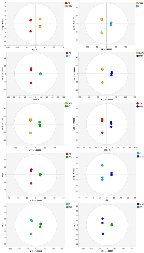 Then, orthogonal partial least squares discriminant analysis (OPLS-DA) (Figure 3) and variable importance in projection analysis (VIP) helped to further identify the metabolites with the highest discriminative power, highlighting the molecules that contributed most significantly to the observed differences among the samples.