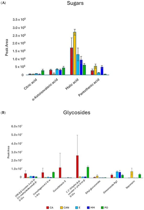 The most abundant compounds in the extracts were sugars, on which the quantitative data are reported in Figure 4A. Fructosyl valine was the predominant sugar in CA and MM samples, while glucose-1-phosphate and eritrose-4-phosphate were present at higher amounts in CA, E, and MM samples.