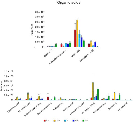 Regarding organic acids (Figure 6), CAN presented the highest content of them. Malic acid was the most abundant metabolite found in our analysis, and it was significantly higher in CAN than in the other samples. The same trend was found for citramalic acid, predominating in CAN. Quinic acid was significantly higher in CAN and PO than in MM, CA and E, while jasmonic acid methyl ester was significantly higher in CAN than in CA and E, but not when compared with MM and PO.