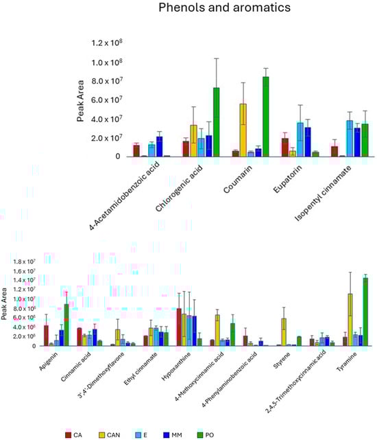 Among phenols and aromatic compounds (Figure 7), we observed significantly higher content of chlorogenic acid in PO than in E and MM and of coumarin in PO and CAN than in MM, CA, and E. Acetoamidobenzoic acid and eupatorin were the only two aromatic compounds less abundant in CAN and PO than in MM, CA, and E. Significantly larger quantities of styrene, tyramine, and methoxycinnamic acid were found in CAN and PO than in MM, CA, and E.