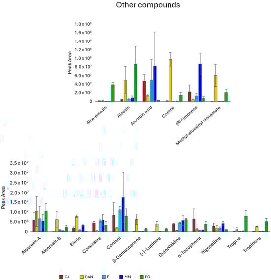 Concerning other compounds (Figure 8), the antraquinone aloe-emodin predominated in PO compared with the other samples, while the C-glycosilated chromone aloesin was more abundant in PO than in CA, E, and MM. Coniine and methyl aloesinyl cinnamate were both significantly more abundant in CAN and PO, since they were nearly absent in CA, E, and MM. The monoterpene limonene showed high abundancy in MM. The quantity of the vitamin B8 (biotin) was significantly higher in CAN.