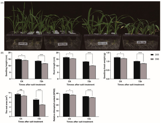 Distinct growth responses to salt stress were observed between the salt-tolerant line D55 and salt-sensitive line D96 at 72 h post-treatment. The D96 seedlings exhibited leaf senescence and marginal necrosis under salt stress (Figure 1A), whereas D55 maintained stable leaf morphology. In control conditions, D55 and D96 showed significant differences (p < 0.05) in seedling height, root length, seedling fresh weight, and relative chlorophyll content (SPAD value), but not in root surface area (Figure 1B). Under salt stress, all five parameters differed markedly between the genotypes (p < 0.0001), with D96 displaying greater reductions, in terms of seedling height (14.65%), root length (23.37%), fresh weight (12.92%), root surface area (30.34%), and chlorophyll content (5.59%), compared to D55 (Figure 1B). These results confirm D55’s superior salt tolerance during early seedling development.
