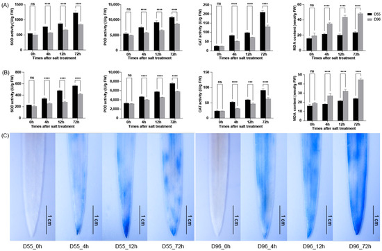 ROS scavenging dynamics in D55 and D96 under salt stress. Time-course changes in antioxidant enzyme activities and MDA levels in leaves (A) and roots (B). (C) Trypan blue staining showing membrane integrity. Data represent mean ± SE (n = 3). Dunnett’s test was used for the comparative analysis between D55 and D96. Asterisks denote significant differences between D55 and D96 (ns, not significant; *** p < 0.001; **** p < 0.0001).