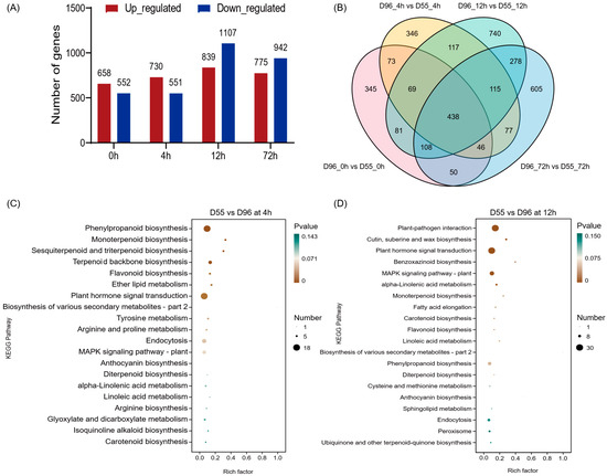 DEGs and functional enrichment between D55 and D96. (A) Temporal dynamics of DEGs after 0 h, 4 h, 12 h, and 72 h salt treatment. (B) Venn diagram illustrating genotype-specific DEG distributions. (C) KEGG pathway enrichment of DEGs at 4 h post-treatment. (D) KEGG pathway enrichment of DEGs at 12 h post-treatment.