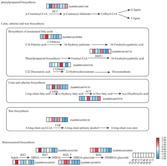 Lignin, cutin/suberin/wax, and benzoxazine biosynthetic pathways play key roles in the complex regulatory network of plant response to salt stress [49,50,51]. Transcriptomic profiling revealed significant enrichment of DEGs within three critical pathways: phenylpropanoid metabolism (zma00940), cutin/suberin/wax biosynthesis (zma00073), and benzoxazinoid biosynthesis (zma00402). D55 exhibited upregulated expression of Zm00001eb041100, Zm00001eb249960, and Zm00001eb146710, which drive 16-hydroxypalmitate, 16-feruloyloxypalmitate, and docosanedioate biosynthesis—core precursors for cutin monomers [52]. At 12 h post-salt treatment, coordinated induction of Zm00001eb074170, Zm00001eb308150, and Zm00001eb039570, enhanced cutin/suberin transmembrane transport and oxidative polymerization, facilitating apoplastic barrier formation in roots [53].