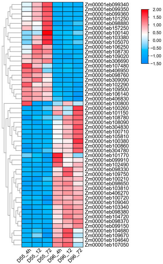 A clustering analysis and expression heatmap of the 52 consistent DEGs across three time points revealed distinct expression patterns (Figure 7). Twenty-one genes exhibited significantly higher expression in the salt-tolerant parent D55, suggesting potential roles as positive regulators of salt stress adaptation. Sixteen of these genes were localized to chromosome 2, with one gene on chromosome 3 and two genes each on chromosomes 7 and 10. Notably, three transcription factors including Zm00001eb099340, Zm00001eb108730, and Zm00001eb306690 were identified within this subset.