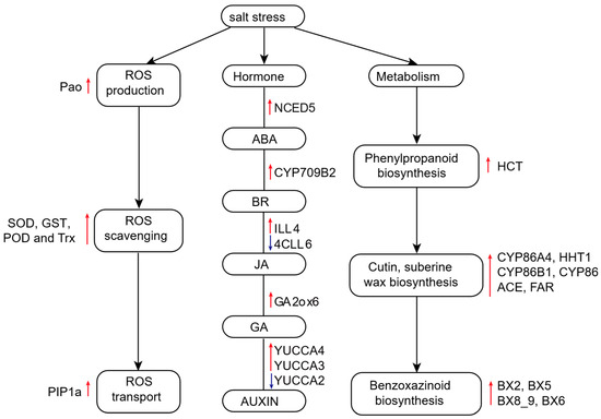A hypothetical model of the response mechanism for salt stress in sweet corn seedlings. The red arrows indicate upregulated gene expression in the tolerant sweet corn genotype D55, and the blue arrows indicate the upregulated gene expression in the sensitive sweet corn genotype D96.