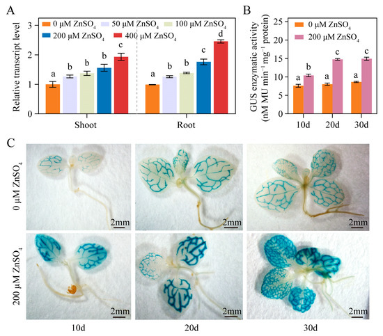 The Zninduced expression of the NtPCS1 gene. (A) The effect of ZnSO4 treatment on the transcript level of NtPCS1 in WT tobacco plants was detected by qRT-PCR. WT plants were treated with various concentrations of ZnSO4 (0, 50, 100, 200, and 400 μM) for 48 h. Values represent means ± SD of three biological replicates. Different letters indicate statistically significant differences (one-way ANOVA followed by a Tukey’s HSD test, p < 0.05). Separate statistical analyses were conducted for shoot and root samples. (B,C) The effect of ZnSO4 treatment on the transcription activation of the GUS gene driven by the 1097 bp promoter of NtPCS1 was detected via GUS enzymatic activity (B) and GUS staining (C) assays. Transgenic tobacco seeds expressing pBI121-NtPCS1pro::GUS were germinated and grown on 1/2 MS medium supplemented with 0 or 200 μM ZnSO4 for 10, 20, or 30 days. Values represent means ± SD of three biological replicates. Different letters indicate statistically significant differences (two-way ANOVA followed by a Tukey’s HSD test, p < 0.05). Three independent transgenic tobacco lines expressing pBI121-NtPCS1pro::GUS were used in (B,C), and similar results were obtained.