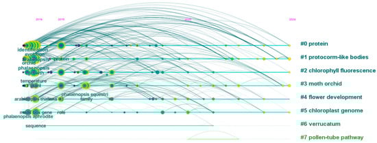 A temporal evolution visualization of keyword frequencies in Phalaenopsis research (2014–2024). The co-occurrence network was generated from articles indexed in Web of Science Core Collection using “Phalaenopsis” as the search term (2014–2024 publications) and analyzed through CiteSpace software (version 6.2.R4).