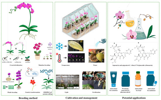 The Phalaenopsis genus, a horticulturally vital group within the Orchidaceae, dominates global floriculture markets through strategic cultivar innovation, scalable propagation, and data-driven cultivation. This review systematically examines the breeding, propagation, cultivation management, and potential applications of Phalaenopsis while providing insights into future research directions. The main contents include the following: Breeding innovations—This review outlines the taxonomy of the Phalaenopsis genus and highlights its intergeneric hybridization potential, which offers vast opportunities for developing novel horticultural varieties. By establishing clear breeding objectives, researchers employ diverse breeding strategies, including conventional crossbreeding and biotechnological approaches (e.g., mutation breeding, ploidy manipulation, genetic transformation, and CRISPR/Cas9 editing). Propagation and cultivation management—Analyses of Phalaenopsis tissue culture protocols covering explant selection, media optimization, and regeneration systems are summarized. Key factors for efficient cultivation are discussed, including temperature, light, water, nutrient management, cultivation medium selection, and integrated pest/disease management. Scientific environmental control ensures robust plant growth, synchronized flowering, and high-quality flower production. Emerging applications—Phalaenopsis exhibits promising applications in functional bioactive compound extraction (e.g., antioxidants and antimicrobial agents). This review summarizes current advancements in Phalaenopsis breeding, cultivation, and potential applications. Based on technological progress and market demands, future research directions are proposed to support the sustainable development of the Phalaenopsis industry.