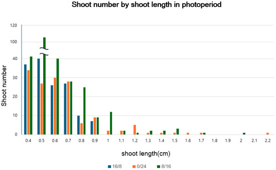 The average shoot length under the 8/16 (light/dark) photoperiod was the highest at 0.60 cm, with a statistically significant difference (Table 2). There was no statistically significant difference between darkness and the 16/8 photoperiod under fluorescent light. This is because newly generated shoots were short in length but numerous, making it difficult to detect significant differences when analyzing the average. However, naked-eye observations confirmed that the shoots of plants grown under darkness (0/24 photoperiod) were much longer, with the longest shoot length reaching up to 2.2 cm, as shown in Table 2. The number of shoots for each treatment was plotted on a graph based on their respective lengths (Figure 1). When comparing the 16/8 photoperiod with continuous darkness, although the average shoot length was not the highest under the dark treatment (Table 2), the proportion of longer shoots (exceeding 0.6 cm) was relatively greater, as shown in Figure 1. Overall, the fluorescent 8/16 photoperiod, which resulted in the longest average shoot length among the three light treatments, was the most optimal condition for shoot elongation in S. koreensis. However, when considering the number of shoots within each length category, darkness was more effective in generating longer shoots compared to the 16/8 fluorescent light treatment. As the duration of darkness increased, etiolation of the cultures was observed (Figure 2).