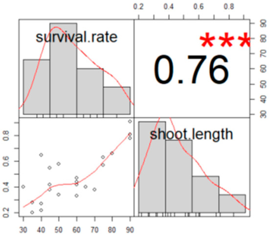 Correlation between survival rate (%) and shoot length (cm). Pearson correlation coefficients, and significance is denoted by asterisks (*** p ≤ 0.001).