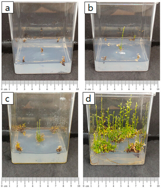 Effect of initial explant clump size on S. koreensis cultures: (a) one shoot, (b) two shoots, (c) five shoots, (d) ten shoots.