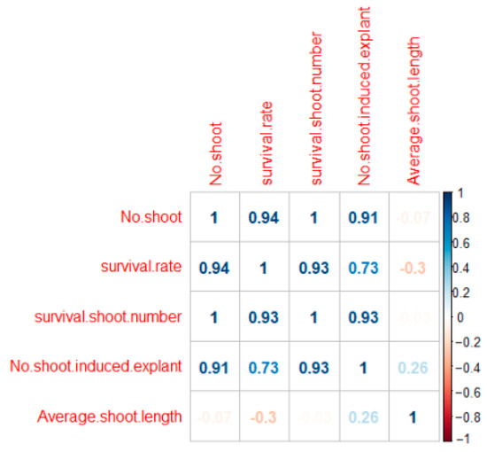 Analysis of the correlation between survival rate and average shoot length indicated a positive correlation, with a correlation coefficient of 0.756 (Figure 3). This suggests that longer average shoot length is associated with higher survival rates.