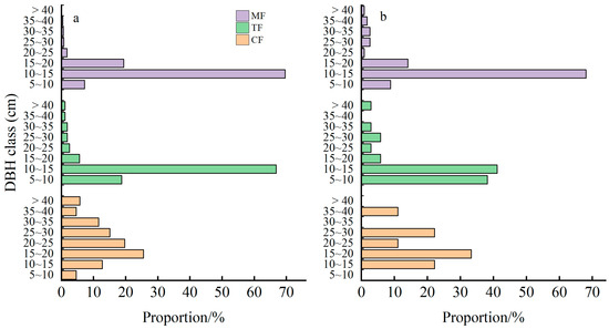 As shown in Figure 1, the diameter class structure of living stems in the three forest stands generally exhibited unimodal distributions, with the proportional distribution initially increasing and then decreasing as diameter classes advanced. In the CF, diameter classes were predominantly distributed in 10–15, 15–20, 20–25, 25–30, and 30–35 cm, cumulatively accounting for 84.9% of the total. The TF showed concentration in 5–10 cm and 10–15 cm classes, representing 18.8% and 66.9% of the total, respectively. In the MF, diameter classes were primarily distributed in 10–15 cm and 15–20 cm, constituting 69.7% and 19.4% of the total. These results indicate that as Moso bamboo expanded into the CF, large-diameter living stems progressively declined, and the range of diameter class distribution narrowed. Furthermore, as revealed in Table 1, the diameter classes of Moso bamboo within MF exhibited an increasing trend compared to those in TF.