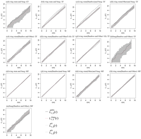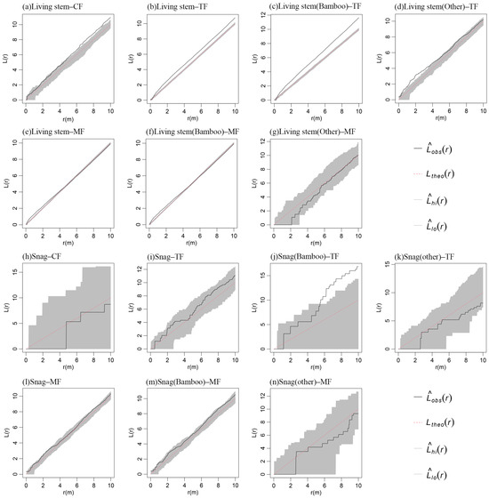 Spatial distribution patterns of standing stems were analyzed using Ripley’s L-function, an improved version of Ripley’s K-function [46]. The K-function quantifies spatial aggregation by evaluating the expected number of plants within radius r across the study area, defined as , where K(r) is cumulative spatial clustering intensity at scale r. A is plot area, n is the individuals count within the sampling domain, uij is the distance between two points i and j, Ir (uij) is the indicator function, (=1 if uij ≤ r, else = 0), and wij is the edge correction weight accounting for incomplete circular sampling at plot boundaries. Compared to K(r), L(r) provides a more intuitive visualization of computational results in graphical representations. The calculation formula for Ripley’s L function is expressed as follows: [47]. The 99% confidence envelope was established through the Monte Carlo simulation method. L(r) values exceeding the upper simulation envelope indicate a clustered distribution pattern, while those falling between the upper and lower envelopes suggest random distribution. Values below the lower envelope demonstrate uniform distribution characteristics. Spatial relationships were analyzed using bivariate point pattern analysis. The fundamental formula is [48]. The square root transformation yielded . Spatial correlations between living and dead standing stems were investigated using the bivariate pairwise function L12(r), which simultaneously characterizes inter-group relationships and intra-group spatial patterns. A Monte Carlo simulation procedure generated 99% confidence envelopes. When L12(r) values fall within the simulation envelopes, spatial independence is indicated. Values exceeding the upper envelope demonstrate significant positive spatial association (attraction), whereas values below the lower envelope reveal negative spatial association (repulsion). All analyses were conducted using the spatstat package in R 4.1.3 [47].