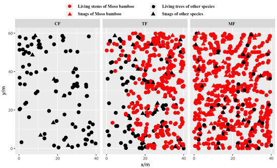 Snags in the three stand types primarily exhibited random distribution across 0–10 m scales (Figure 2h–n), aligning with the visual patterns observed in the spatial distribution maps (Figure 3). An exception occurred in the bamboo–tree mixed forest, where dead Moso bamboo plants displayed aggregated distribution at 6–10 m scales (Figure 2j).