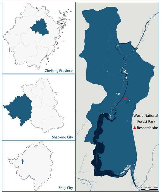 The study area is situated within Zhejiang Wuxie National Forest Park (29°44′15″ N, 120°02′40″ E), geologically belonging to the northeast-trending branch of the Longmen Mountain Range (Figure 5). This region exhibits a characteristic subtropical monsoon humid climate (Cfa) with distinct seasonal variations, while the altitude is generally below 500 m, featuring a mean annual temperature of 16.2 °C and annual precipitation averaging 1347 mm. The dominant soil type is Ferralsols, and bedrock is mainly volcanic rocks and granite. The vegetation structure is dominated by coniferous-broadleaved mixed forests and Moso bamboo (Phyllostachys edulis) forests. Owing to the vigorous rhizome expansion capacity of Moso bamboo, a transitional forest belt—characterized as bamboo–arbor mixed forest—has naturally formed at the ecotone between these two primary vegetation types. The main plant species of coniferous broad-leaved mixed forest include Pinus massoniana, Cunninghamia lanceolata, Schima superba, Liquidambar formosana, Castanopsis eyrei, Cyclobalanopsis glauca, etc.