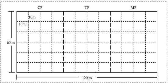 Previous studies have demonstrated that sampling plot size significantly influences spatial pattern interpretation in point pattern analysis [44]. Notably, excessively large plots (>1 ha) may predominantly reflect spatial characteristics of habitat patches while masking individual-level patterns of plant populations. Conversely, insufficiently small plots (<0.04 ha) may fail to adequately capture population-level spatial distribution features due to limited sampling representativeness [45]. To investigate spatial pattern relationships between live and dead stems at 0–10 m scales across distinct bamboo invasion stages, a 120 m × 60 m permanent plot along Moso bamboo expansion front transitioning into coniferous and broad-leaved mixed forest (aligned with the width of the transitional forest belt) was established in 2023 on a gently sloping terrain within a subtropical transitional forest. The plot, surrounded by a 10 m buffer zone to mitigate edge effects, encompassed three forest types representing sequential bamboo (Phyllostachys edulis) expansion phases: (1) coniferous and broad-leaved mixed forest (CF, uninvaded by bamboo), (2) transition forest (TF, bamboo-to-tree basal area ratio ≈ 1:1), and (3) Moso bamboo forest (MF, near-monoculture stand), formed through bamboo natural colonization into coniferous–broadleaf forests, leading to progressive mortality of native tree species (Figure 6). A total of 72 10 m × 10 m quadrats (24 per forest type) were included (Table 2). All living stems with a diameter at breast height (DBH) ≥ 5 cm, including snags, were permanently tagged and georeferenced. Standardized measurements encompassed species identification, DBH (recorded to 0.1 cm precision), and spatial coordinates relative to quadrat origin (±10 cm positional accuracy).