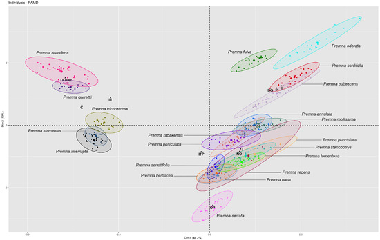Although most Premna in Thailand have not yet been included in phylogenetic studies, we discovered that fruit shapes hold limited taxonomic significance across species. The first two FAMD dimensions accounted for 63.2% of the total information (Figure 1). The analyses successfully separated several taxa based on the overall data, thereby confirming the usefulness of FAMD in detecting taxonomic patterns associated with fruit characteristics. While a minimum of 20 specimens was initially targeted for each taxon, three taxa, namely P. punctulata, P. repens, and P. siamensis, were represented by 6 to 10 specimens due to limited availability. However, FAMD analyses revealed considerable variability within these taxa.
