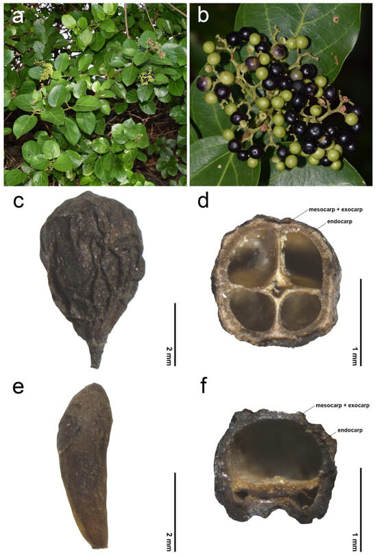 General fruit morphology of Premna in Thailand. (a) Fruiting branch of P. serratifolia; (b) infructescence of P. serratifolia; (c) mature fruit type I (P. serratifolia) (LM); (d) cross-section of mature fruit type I (P. serratifolia) (LM); (e) mature fruit type II (P. scandens) (LM); (f) cross-section of mature fruit type II (P. scandens) (LM).