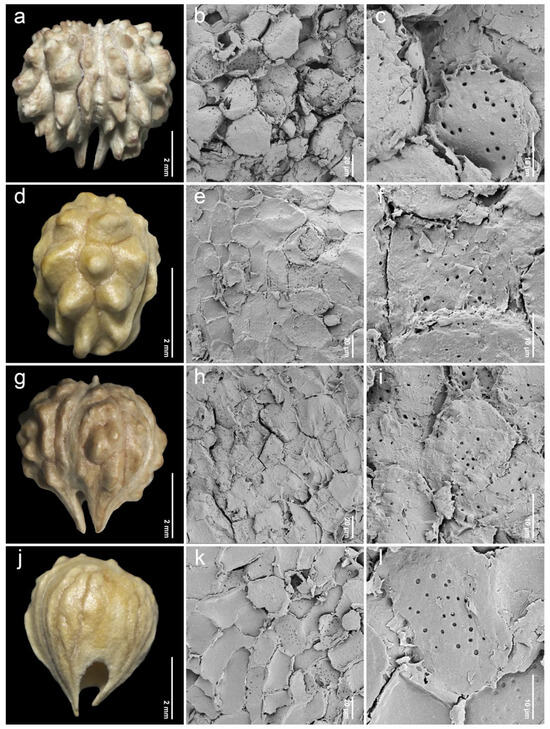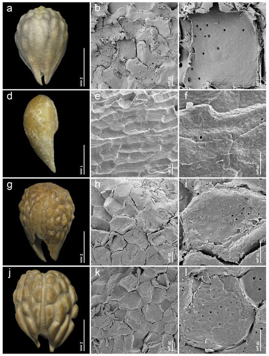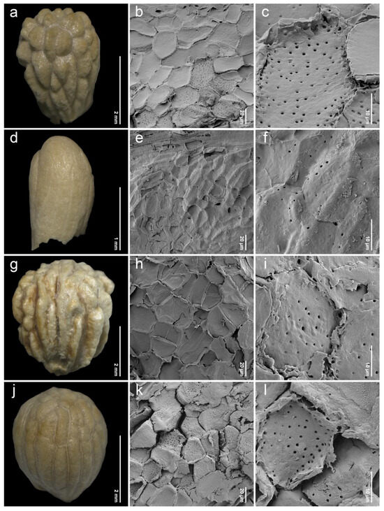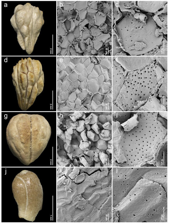Endocarp micromorphology of Premna in Thailand. (a,d,g,j) Endocarp outline (LM); (b,e,h,k) endocarp surface (SEM); (c,f,i,l) closed-up pitted cells on endocarp surface (SEM). (a–c) P. annulata; (d–f) P. cordifolia; (g–i) P. fulva; (j–l) P. garrettii.