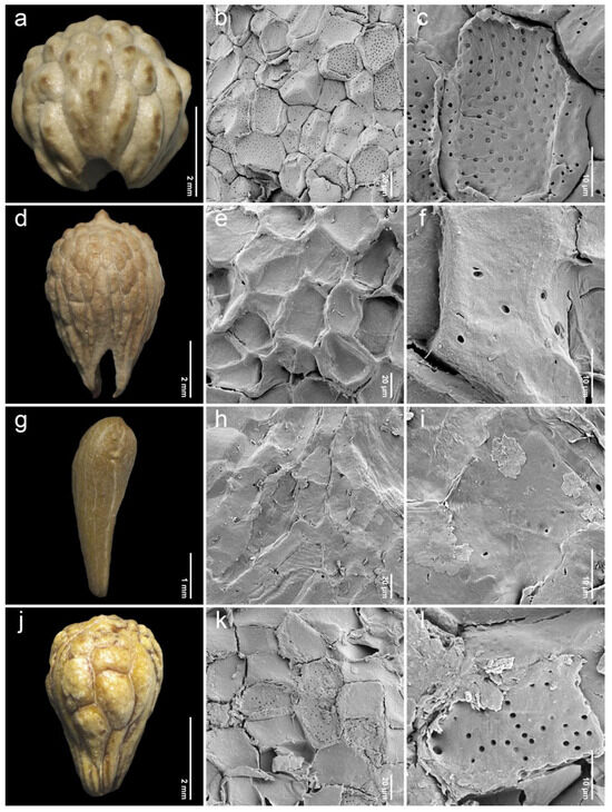 Endocarp micromorphology of Premna in Thailand. (a,d,g,j) Endocarp outline (LM); (b,e,h,k) endocarp surface (SEM); (c,f,i,l) closed-up pitted cells on endocarp surface (SEM). (a–c) P. serratifolia; (d–f) P. siamensis; (g–i) P. stenobotrys; (j–l) P. tomentosa.
