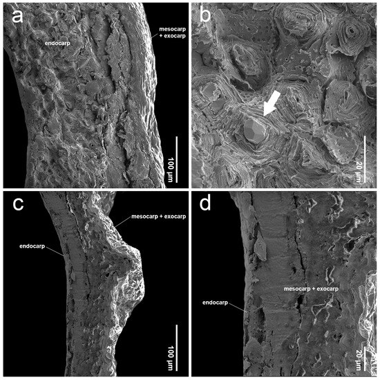Investigations under SEM revealed the characteristics of sculptured cells on the endocarp surface and the components within the tissue layers (Figure 3, Figure 4, Figure 5, Figure 6, Figure 7 and Figure 8). The surface displays sculptured cells made up of uniform or irregular shapes, primarily tetragonal to polygonal, with straight or occasionally indistinct faces. In all species, the cell surfaces are generally smooth and have pitted cell walls, indicating a connection to the mesocarp cells and seeds [52]. This porous structure enables the transport of air, water, or other nanofluids through the plant structure, supporting imbibition and cellular respiration during embryo germination [52,53,54,55,56]. The endocarp surface associated with fruit type I is likely to more frequently exhibit pitted cell walls, which correlate with the shape and thickness of the pericarps. Fruit type II and the lack of endocarp protrusion (protrusion type III) show fewer pits. However, further anatomical studies are needed to investigate the functional role of the pits on the endocarp surface.