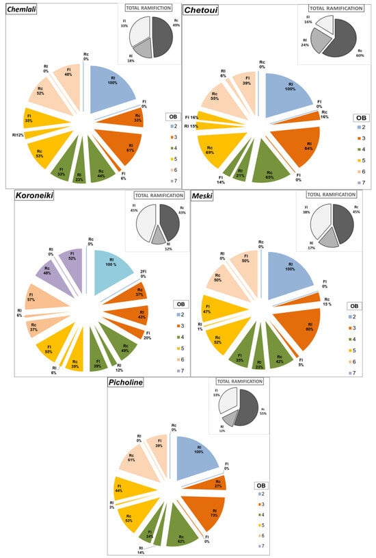The highest percentage of short shoots developed per architectural unit was observed in the cultivar Chetoui (60%), followed by the cultivars Picholine (55%), Chemlali (49%), Meski (45%), and Koroneiki (43%) (Figure 1). At the scale of botanical order (OB), the highest ratio of short shoots compared to the total shoots developed in the same botanical order (Rl, Rc, and Fl) was located in the 5th botanical order (OB5). It was about 69%, 53%, and 52% for the Chetoui, Chemlali, and Meski cultivars, respectively (Figure 1). On the other hand, the cultivars Koroneiki and Picholine had the highest percentage of short shoots compared to the total number of shoots developed in the 4th (49%) and 6th (62%) botanical orders, respectively (Figure 1). The cultivar Koroneiki produced the highest percentage of inflorescences per architectural unit (45%), followed by the cultivars Meski (38%), Chemlali (33%), Picholine (33%), and Chetoui (16%) (Figure 1). At the scale of botanical order (OB), the highest percentages of inflorescences compared to the total shoots developed in the same botanical order for the cultivars Meski (50%), Chemlali (48%), Chetoui (39%), and Koroneiki (57%) were in the 6th botanical order (OB6) (Figure 1).