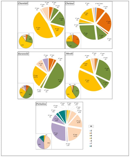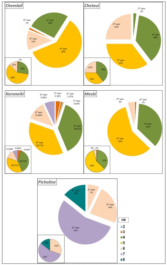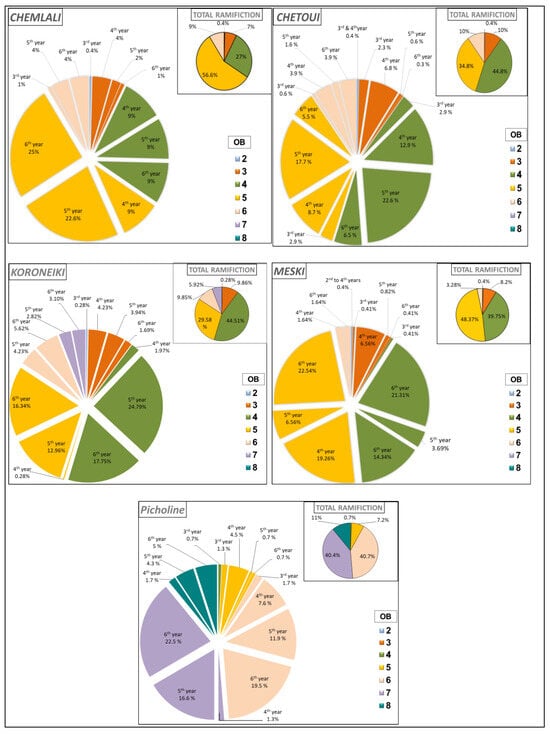 Regarding the branching density, the highest percentage in the OB3 was found at the level of shoots developed in the 4th year (2013) with consecutive percentages of 42.86% (Koroneiki), 61.11% (Chemlali), 80% (Meski), 67.74% (Chetoui) of the total shoots developed in the OB3 for each studied cultivar (Figure 2). The highest branching density in the OB4 was marked on the shoots developed either in the 4th year (2013), with consecutive percentages of 34.29% (Chemlali) and 53.61% (Meski), or in the 5th year (2014), with consecutive percentages of 55.70% (Koroneiki) and 50.36% (Chetoui) of the total shoots developed in the same botanical order (OB4) for each of the studied cultivars (Figure 2). In the OB5, the highest density of branching was found on the shoots developed either in the 4th year (2013), with consecutive percentages of 63.64% (Picholine) and 46.61% (Meski), or on the shoots developed in the 6th year (2015), with consecutive percentages of 55.24% (Koroneiki) and 43.92% (Chemlali) of the total shoots developed in the same botanical order (OB5) for each of the studied cultivars (Figure 2).