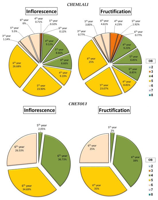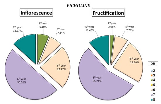 Indeed, the cultivars Chemlali and Chetoui produced the majority of their inflorescences as well as their fruits in the same botanical order (OB5 and OB4) respectively, with a percentage of 59.77% and 38.78% of the total inflorescences and 56.92% and 40% of the total fruits, respectively (Figure 6). The cultivar Picholine had the same tendency as the cultivars Chetoui and Chemlali, with 50.02% of the total inflorescences and 55.21% of the total fruits produced by the architectural units of the OB7 (Figure 8).