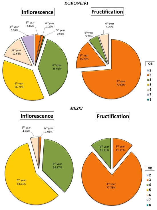 The Meski and Koroneiki cultivars behaved very differently. They produced the majority of their inflorescences and fruits in different botanical orders. The first cultivar (Meski) developed 58.51% of its inflorescences in the OB5 and 88.89% of its fruits in the OB3 (Figure 7), while the second cultivar (Koroneiki) developed 38.61% of its inflorescences in the OB4 and 89.47% of its fruits in the OB3 (Figure 7).