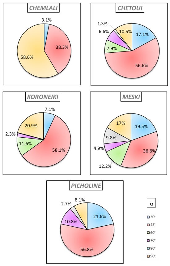 The distribution of the shoots according to their insertion angles as well as the year of development of their supporting shoots (Figures S1–S6), it was noticeable that all the shoots of the 3rd year (2011) for the cultivars Koroneiki, Chemlali, and Meski formed angles of 90° with their supporting shoots (Figure S6). For the cultivar Koroneiki, 100% of shoots made branching angles of either 60° (Figure S3) or 70° (Figure S4) with their supporting branches are shoots of the 4th year (2013), while for the cultivars Chemlali and Picholine, 100% of the shoots creating insertion angles of 30° (Figure S1) and 80° (Figure S5), respectively are shoots of the 4th year (2013). All the shoots of the cultivar Meski developed in the 6th year (2015) made angles of insertion of 30° (Figure S1) with their supporting branches. All the shoots of the cultivar Picholine developed in the 5th year (2014) made angles of insertion of 45° with their supporting shoots (Figure S2).