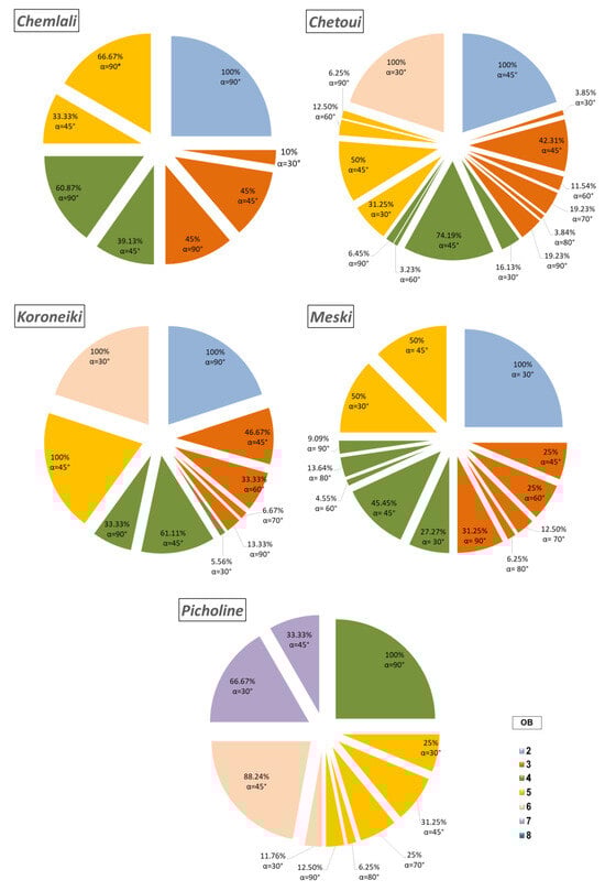 The average insertion angle of the shoot with its supporting shoot showed a significant difference between the cultivars (Figure 9). In fact, this angle varied from 30° to 90°. For all the studied cultivars, the angle that the shoot made with its support shoot depended strongly on the botanical order (Figure 10). It is noteworthy that all shoots of the OB2 of the cultivar Meski and all shoots of the OB6 of the cultivars Koroneiki and Chetoui made an angle of 30° with their supporting branches (Figure 10). All shoots of the OB5 and the OB2 of Koroneiki and Chetoui cultivars, respectively, formed angles of 45° with their supporting shoots (Figure 10). All the OB2 stems of the cultivars Chemlali and Koroneiki and all the OB4 stems of the Picholine cultivar formed angles of 90° with their supporting stems (Figure 10). The cultivars Chetoui and Picholine developed 17.1% and 21.6%, respectively, of their shoots, with an insertion angle of 30° (Figure 9), of which 38.47% and 50%, respectively, were located in the OB5 of each cultivar (Figure S1). The cultivars Chemlali, Meski, and Koroneiki had percentages of 3.1%, 19.5%, and 7.1%, respectively (Figure 9), of the shoots creating angles of insertion of 30°, of which 100%, 87.5%, and 66.67% were located in OB3, OB4, and OB6, respectively (Figure S1). It is noteworthy that 38.3% (Chemlali), 56.6% (Chetoui), 36.6% (Meski), and 58.1% (Koroneiki) of the total number of shoots with angles of insertion were shoots with angles of insertion of 45° (Figure 9), of which 52.9% (Chemlali), 53.5% (Chetoui), 66.7% (Meski), and 44% (Koroneiki) were located in the OB4 of each cultivar (Figure S2). For the cultivars Chetoui, Meski, and Koroneiki, 7.9%, 12.20%, and 11.6%, respectively, of the shoots had branching angles of 60° (Figure 9), of which 50% (Chetoui), 80% (Meski), and 100% (Koroneiki) were found in the OB3 (Figure S3). Only 6.6% (Chetoui), 4.9% (Meski), and 2.3% (Koroneiki) of the total number of shoots developed an angle of 70° (Figure 9) and were all located in the OB3 of each cultivar (Figure S4). On the other hand, 1.3% (Chetoui), 2.7% (Picholine), and 9.8% (Meski) of the total number of shoots created insertion angles of 80° (Figure 9), of which 100% (Chetoui), 100% (Picholine), and 75% (Meski) were located in the OB3, OB3, and OB4, respectively (Figure S5). The largest possible angle that the shoots formed with their supports was 90° (Figure 9). In fact, 58.6% (Chemlali), 10.5% (Chetoui), 8.1% (Picholine), 17% (Meski), and 20.9% (Koroneiki) of the total number of shoots with insertion angles were branched creating insertion angles of 90° (Figure 9), of which 53.85% (Chemlali), 62.5% (Chetoui), 66.67% (Picholine), 71.43% (Meski), and 55.65% (Koroneiki) were located in the OB4, OB3, OB5, OB3 and OB5, respectively (Figure S6).