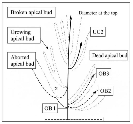 Description of the different levels of organisation: The description of three architectural units [9] per tree at a rate of three trees per variety was carried out with very simple equipment: a tape measure, a digital compass, and a computer. The study was conducted on the growth units [9] selected for each tree [13,29], with observations focusing on shoot development over time. The influence of time was determined by comparing the ability of successive growth units [9] to produce branches, which is informed by the type of branching as well as its nature (short shoot, long shoot), then concerning space (by analysing the ability to produce shoots within each growth unit), and then deducing for each growth unit the intensity of branching (number of shoots formed) and the location of branching (the distribution of these shoots along the unit studied) (Figure 11). The acquisition of data is the starting point for the constitution of the database. The shoots of the olive tree were described from the inside to the outside of the canopy. A topographic coding of these data was then performed [16,29]. These data were organised in an Excel® file according to the MTG coding defined by Annabi [9] and Gaaliche et al. [29], whose structure includes two parts. The first part concerns the position of the architectural unit on the tree, and the second part concerns the different parameters measured for each botanical order (refers to the hierarchical level of branching within a plant’s shoot system [8,9,14]).