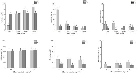 The explants were inoculated on MS (-N), 1/2MS (-N), 1/4MS (-N), and 1/8MS (-N), where -N indicates that the culture medium lacked the main nitrogen sources ammonium nitrate and potassium nitrate. Then, different concentrations of 6-BA (0.5 mg·L−1, 1.0 mg·L−1, and 1.5 mg·L−1) were added to the media, followed by 5 g·L−1 AGAR (AisaBio, Gel strength > 1400 g/cm2) and 0.2 g·L−1 chlorothalonil. Each treatment was controlled with the same proportion of complete nutrient media, marked as F (the treatment media are shown in Table 3). Each treatment was inoculated with three explants per bottle, for a total of 15 bottles, and was repeated three times. The growth status of the explants was observed and recorded. After 40 days of culture, the following bud induction-related indicators were recorded: bud induction rate, contamination rate, browning rate, bud length, and leaf number.